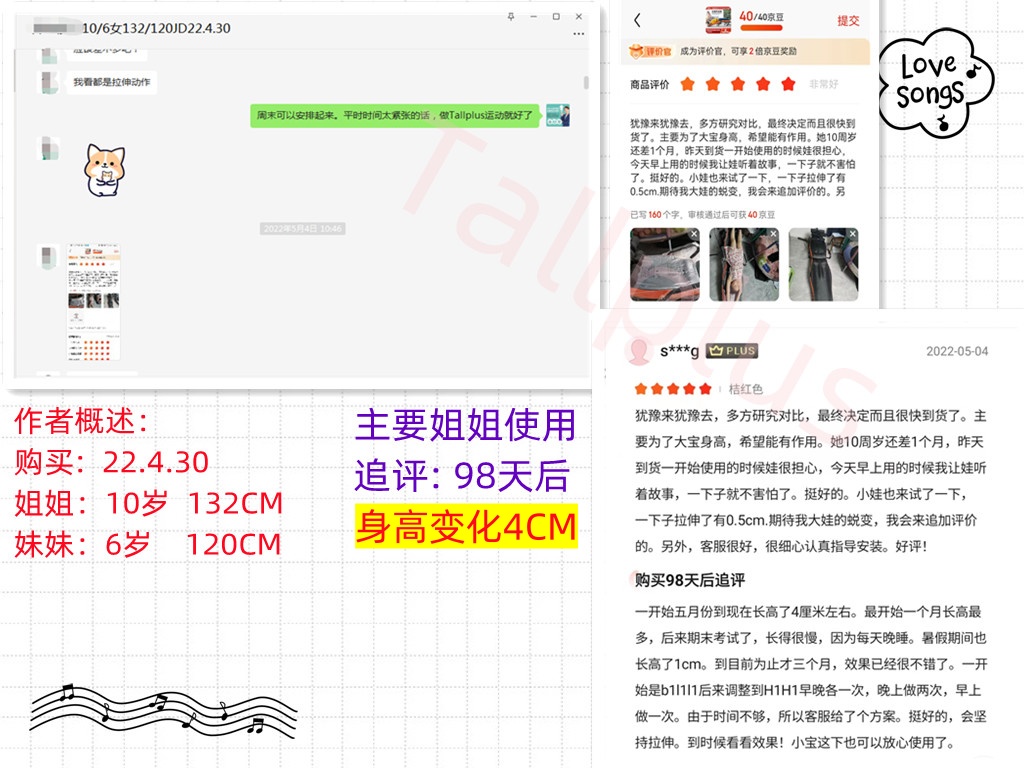 犹豫来犹豫去,多方研究对比,最终决定而且很快到货了。主要为了大宝身高,希望能有作用。她10周岁还差1个月,昨天到货一开始使用的时候娃很担心,今天早上用的时候我让娃听着故事,一下子就不害怕了。挺好的。小娃也来试了一下,一下子拉伸了有0.5cm.期待我大娃的蜕变,我会来追加评价的。另外,客服很好,很细心认真指导安装。好评! 追评:2022-08-06 14:21:35 一开始五月份到现在长高了4厘米左右。最开始一个月长高最多,后来期末考试了,长得很慢,因为每天晚睡。暑假期间也长高了1cm。到目前为止才三个月,效果已经很不错了。一开始是b1l1l1后来调整到H1H1早晚各一次,晚上做两次,早上做一次。由于时间不够,所以客服给了个方案。挺好的,会坚持拉伸。到时候看看效果!小宝这下也可以放心使用了。 | |||